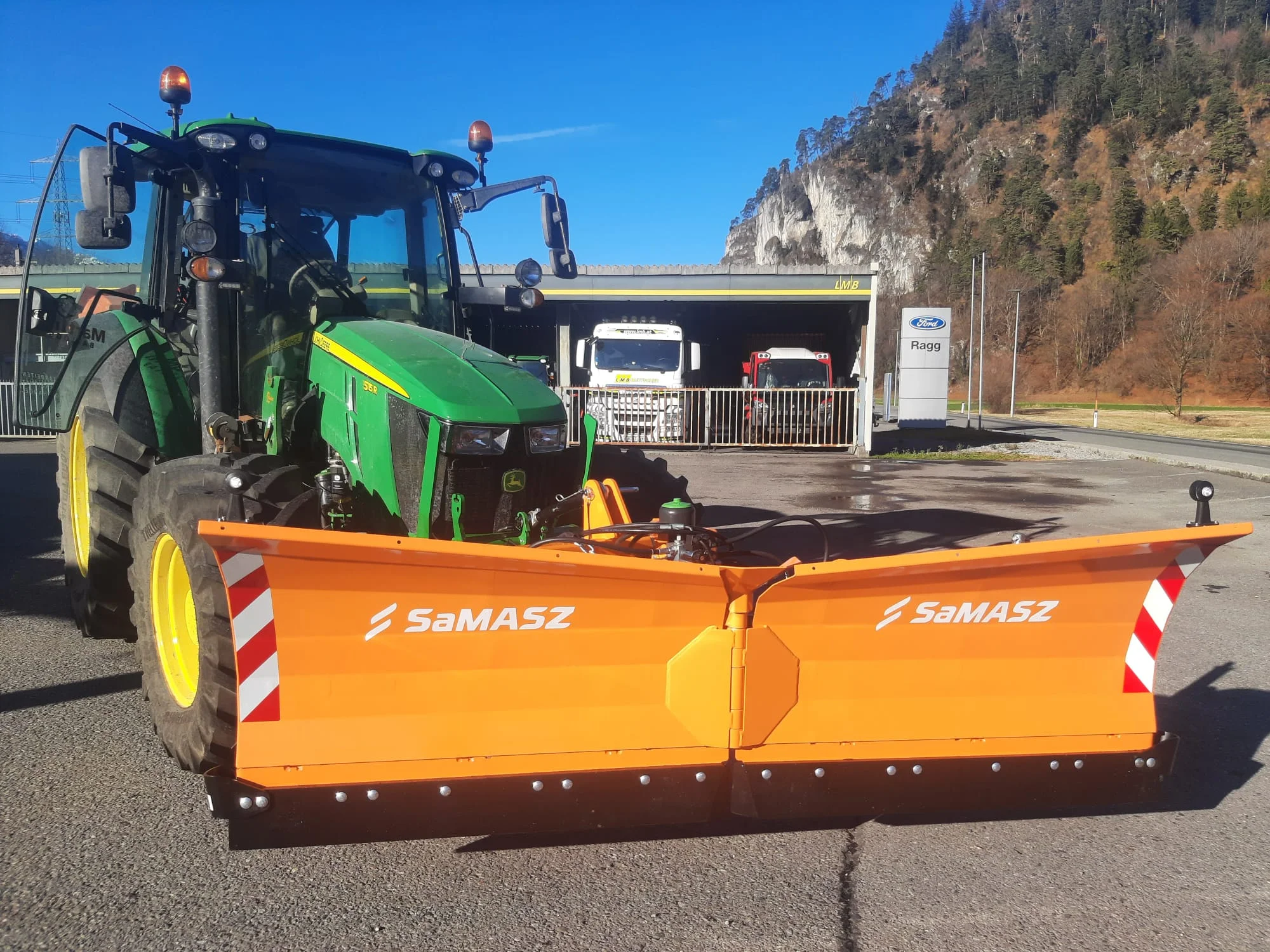 Batlogg Martin aus Lorüns übernimmt einen neuen Samasz Schneepflug PSV 270 für seinen John Deere 5R.