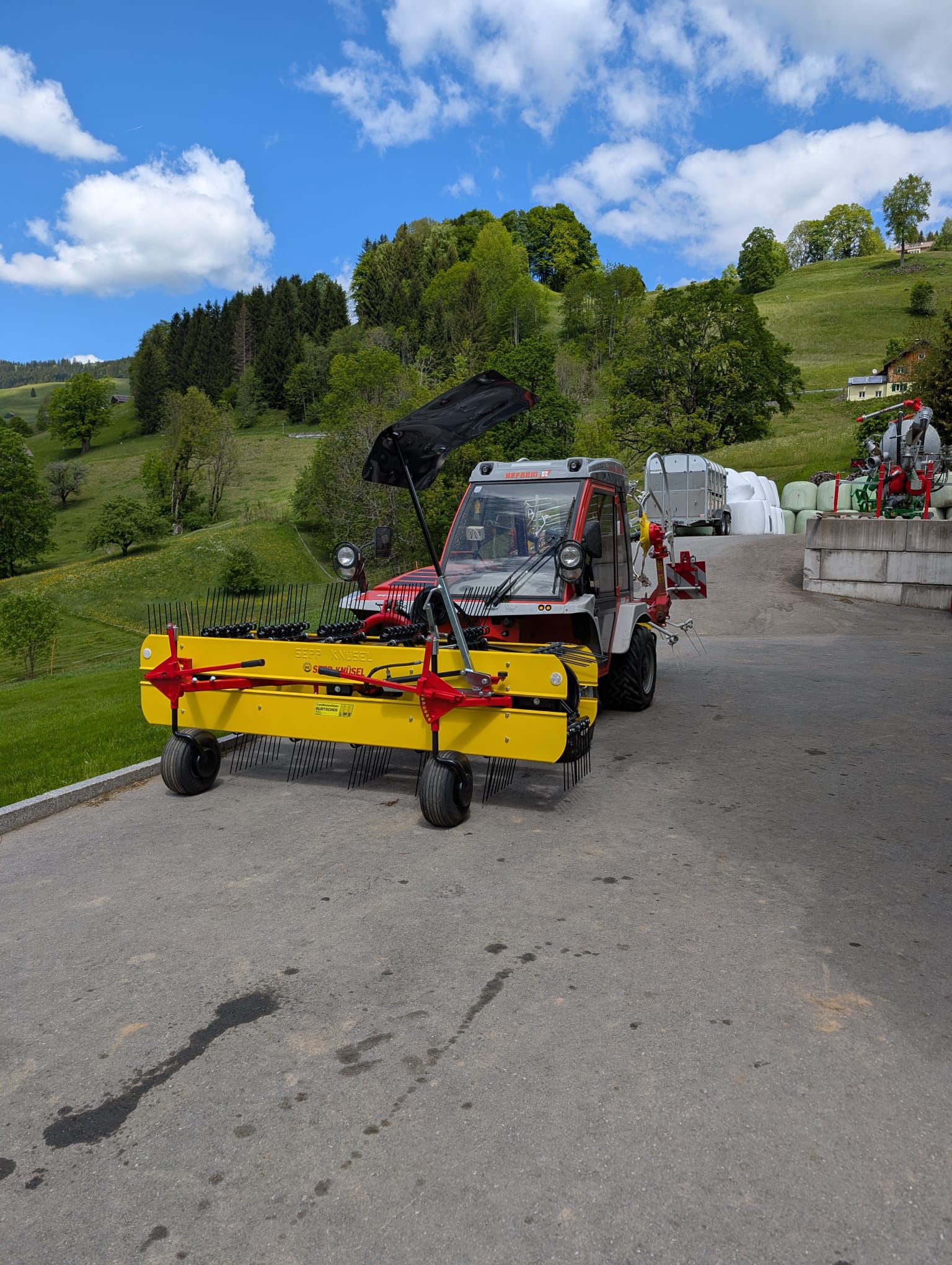 Nesensohn Rainer und Christof aus Innerlaterns erhalten einen neuen Knüsel Bandrechen mit 5 Zinkenreihen und hydraulisch-klappbarem Fangschild.